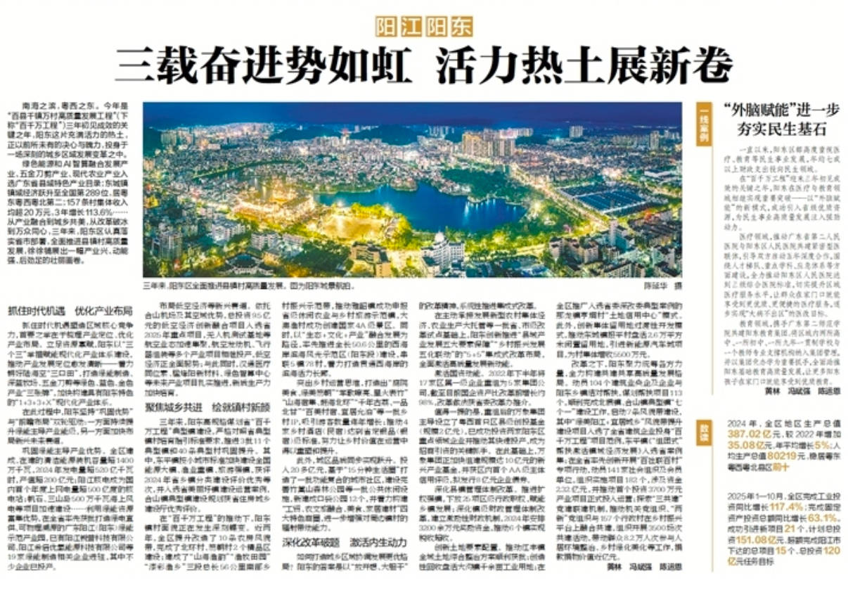南海之滨,粤西之东。今年是“百县千镇万村高质量发展工程”(下称“百千万工程”)三年初见成效的关键之年,阳东这片充满活力的热土,正以前所未有的决心与魄力,投身于一场深刻的城乡区域发展变革之中。