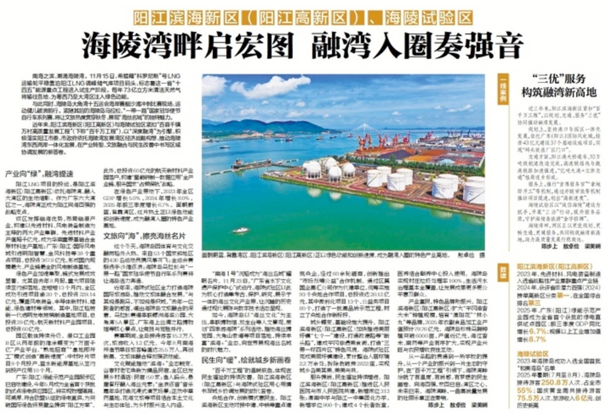 近年来,阳江滨海新区(阳江高新区)与海陵试验区紧扣“百县千镇万村高质量发展工程”(下称“百千万工程”),以“深度融湾”为引擎,积极落实阳江市委、市政府依托海陵湾发展湾区经济战略构想,推动海陵湾东西两岸一体化发展,在产业转型、文旅融合与民生改善中书写区域协调发展的新答卷。