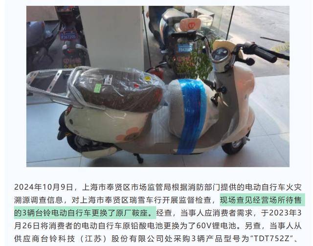 然而,就在新国标全面落地前夕,台铃的渠道合规问题仍在暴露。2025年6月,上海市市场监管局公布的典型案例中,两起涉及电动自行车非法改装的案件均指向台铃授权经销门店——包括擅自加长鞍座、提升电池电压等行为。