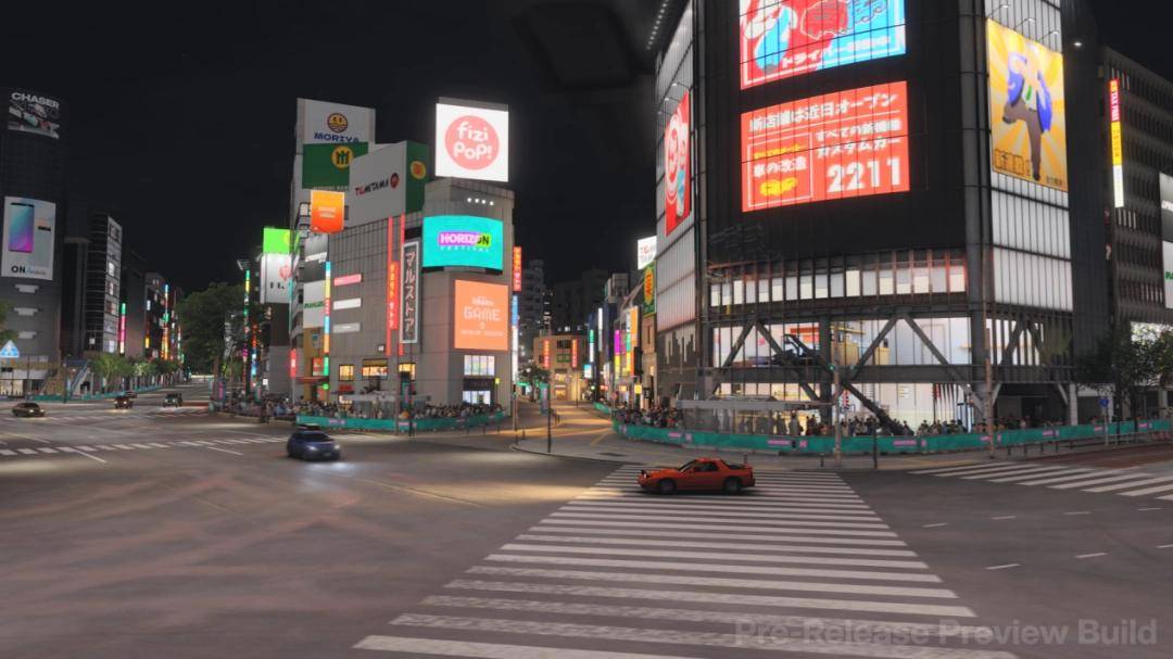 至于很多玩家在首次看到本作的公开演示后,吐槽现实中日本的街道压根不像游戏里这么宽的问题,在试玩时并没有很影响游玩代入感——毕竟,真要把路给你做那么窄,再把车流量拉到和现实中差不多的水平,那别说在街上飙车漂移了,没点技术的话,开一百米少说得撞上十次,到时候才叫真没有游戏体验。而且,《极限竞速:地平线》加入了AI车手和街边的围观群众,这让整个城市鲜活了不少,再加上夜晚的霓虹灯一亮,味道确实一下就上来了。