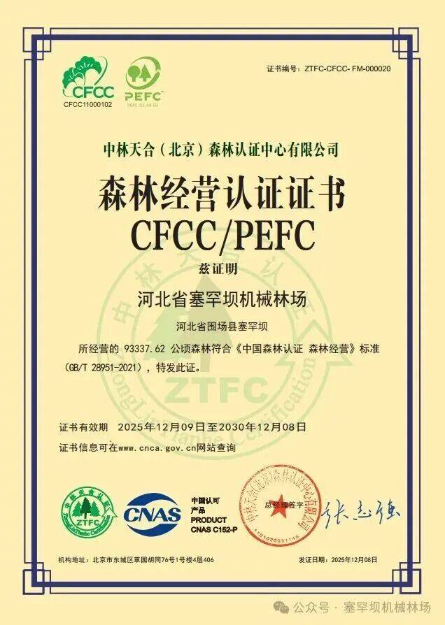 近日,塞罕坝机械林场成功通过CFCC(中国森林认证委员会)/PEFC(国际森林认证体系)森林经营认证,认证期限为2025年12月至2030年12月,认证面积93337.62公顷,标志着塞罕坝林产品拿到拓展国际市场的“绿色通行证”,林场生态价值转化路径进一步拓宽。“十四五”以来,林场累计完成森林抚育54.2万亩,混交林比例由21.4%提高到26.9%,先后获评全国森林可持续经营试点和《联合国森林文书》示范单位。按照规划,到2040年,林场混交林面积将新增24.4万亩,占比超过40%。