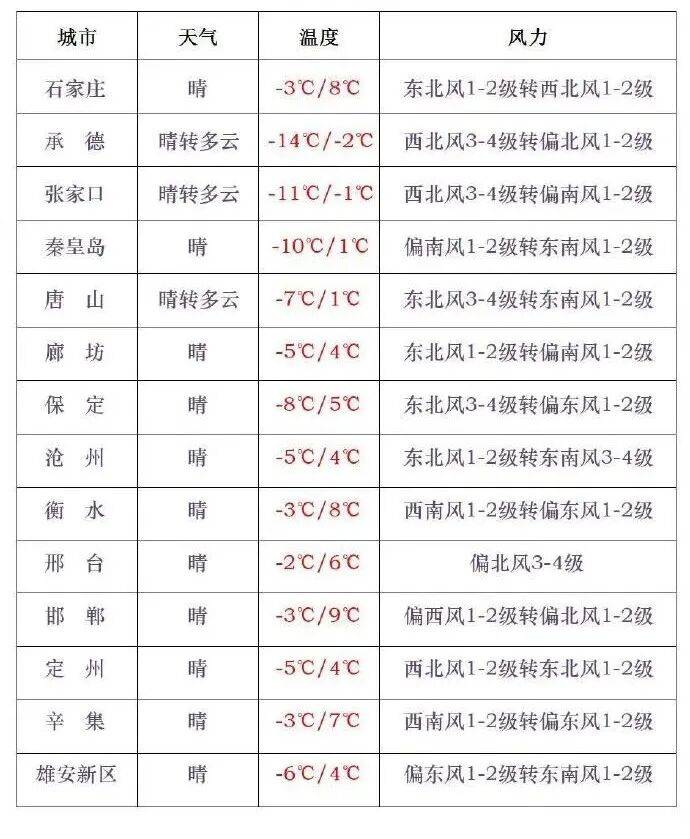 今天白天,保定、廊坊以北地区多云转晴,其中坝上地区短时阴有零星小雪或小雪,其他地区晴间多云。张家口北部、承德北部、秦皇岛北部最高气温-12℃至0℃,其他地区1℃至14℃。
